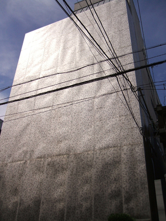 葉っぱ模様のパンチングメタルで覆われた建築。